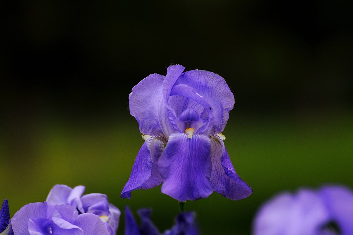 花茎光滑,黄绿色,高60-100厘米,上部有1-3个侧枝,中、下部有1-3枚茎生叶;苞片3枚,草质,绿色,边缘膜质,有时略带红紫色,卵圆形或宽卵形,长2-5厘米,宽2-3厘米,内包含有1-2朵花;花大,鲜艳,直径可达12厘米;花色因栽培品种而异,多为淡紫色、蓝紫色、深紫色或白色,有香味;花被管喇叭形,长约2厘米,外花被裂片椭圆形或倒卵形,长6-7.5厘米,宽4-4.5厘米,顶端下垂,爪部狭楔形,中脉上密生黄色的须毛状附属物,内花被裂片倒卵形或圆形,长、宽各约为5厘米,直立,顶端向内拱曲,中脉宽,并向外隆起,爪部狭楔形;雄蕊长2.5-2.8厘米,花药乳白色;花柱分枝淡蓝色、蓝紫色或白色,长约5厘米,宽约1.8厘米,顶端裂片宽三角形或半圆形,有锯齿,子房纺锤形,长约3厘米,直径约5毫米。