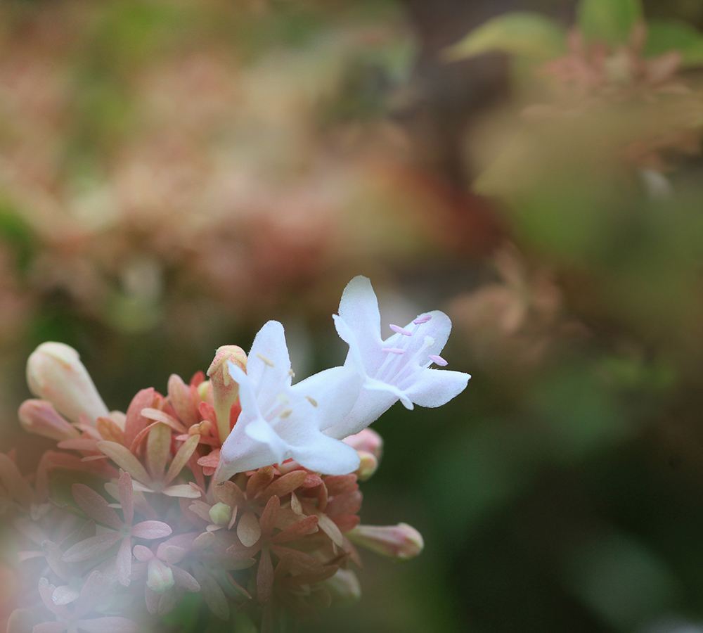 大花六道木是忍冬科,六道木糯米条和蓪梗花的一个杂交种。常绿矮生灌木,幼枝红褐色,有短柔毛;叶片倒卵形,墨绿有光泽。花粉白色,钟形,有香味,花萼大而宿存,粉红色。圆锥花序,开花繁茂,5-11月持续开花。大花六道木分布于中国华东、西南及华北地区。阳性植物,性喜温暖、湿润气候,在中性偏酸、肥沃、疏松的土壤中生长快速,同时其抗性优良,能耐阴、耐寒、耐干早瘠薄、抗短期洪涝、耐强盐碱.。大花六道木花美丽,树叶婉垂,花期从春季至秋季络绎不绝,适宜园林,适植、片植于空旷地块、水边、岩石缝中或建筑物旁、林中树下,是优良的花灌木树种。