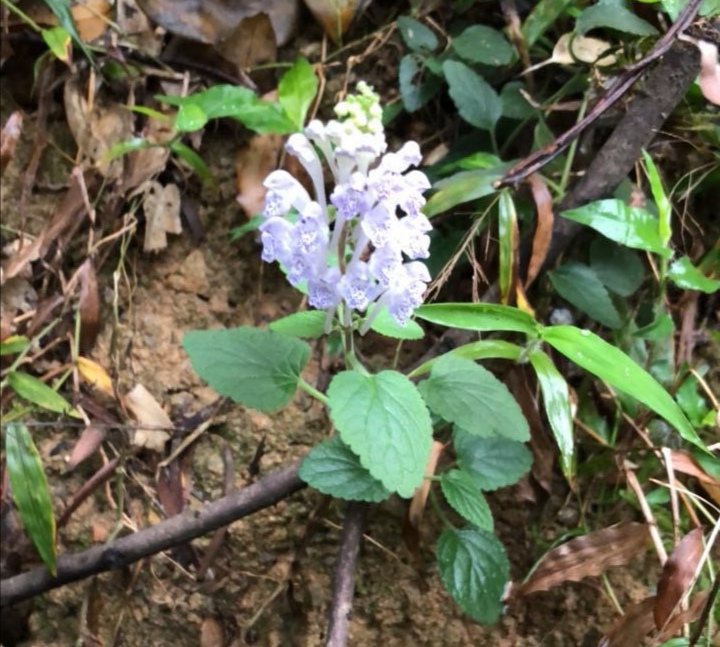 多年生草本;根茎短,向下生出多数簇生的纤维状根,向上生出1至多数茎。茎高12-28厘米,上升直立,四棱形,粗约1-1.2毫米,通常带暗紫色,被微柔毛,尤以茎上部及沿棱角为密集,不分枝或多分枝。叶草质至近坚纸质,心状卵圆形或圆状卵圆形至椭圆形,长1.5-2.6(3)厘米,宽1.2-2.3厘米,先端钝或圆,基部圆形、浅心形至心形,边缘密生整齐圆齿,两面被微柔毛或糙伏毛,尤以下面为甚;叶柄长0.4-1.4(2.8)厘米,腹平背凸,密被微柔毛。花对生,在茎或分枝顶上排列成长4-8(12)厘米的总状花序;花梗长2.5-3毫米,与序轴均被微柔毛;最下一对苞片叶状,卵圆形,长达1.7厘米,边缘具圆齿,其余苞片均细小,卵圆形至椭圆形,长3-6毫米,宽1-2.5毫米,全缘,无柄,被微柔毛。花萼开花时长约2.5毫米,被硬毛及微柔毛,果时十分增大,盾片花时高约1.5毫米,果时竖起,增大一倍。花冠蓝紫色,长1.4-1.8厘米,外疏被微柔毛,内面仅唇片被短柔毛;冠筒前方基部膝曲,其后直伸,向上逐渐增大,至喉部宽约4.5毫米;冠檐2唇形,上唇盔状,内凹,先端微缺,下唇中裂片圆状卵圆形,两侧中部微内缢,先端微缺,具深紫色斑点,两侧裂片卵圆形。雄蕊4,二强;花丝扁平,中部以下具小纤毛。花盘肥厚,前方隆起;子房柄短。花柱细长。子房光滑,4裂。