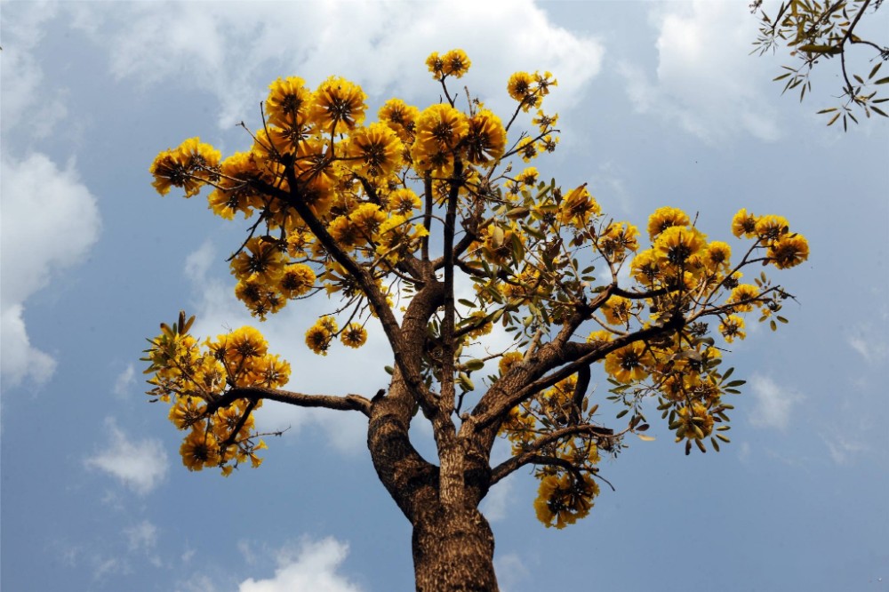 黄钟木四季变化明显,春华、夏实、秋绿、冬枯,赋予季节以色彩。春天风铃状黄花花团锦簇,是春天来临时的指标花卉;夏天萌生的嫩芽满枝桠,接着是翅果纷飞;秋天枝叶繁茂,葱葱郁郁的绿色;冬天枝枯叶落,满是沧桑。