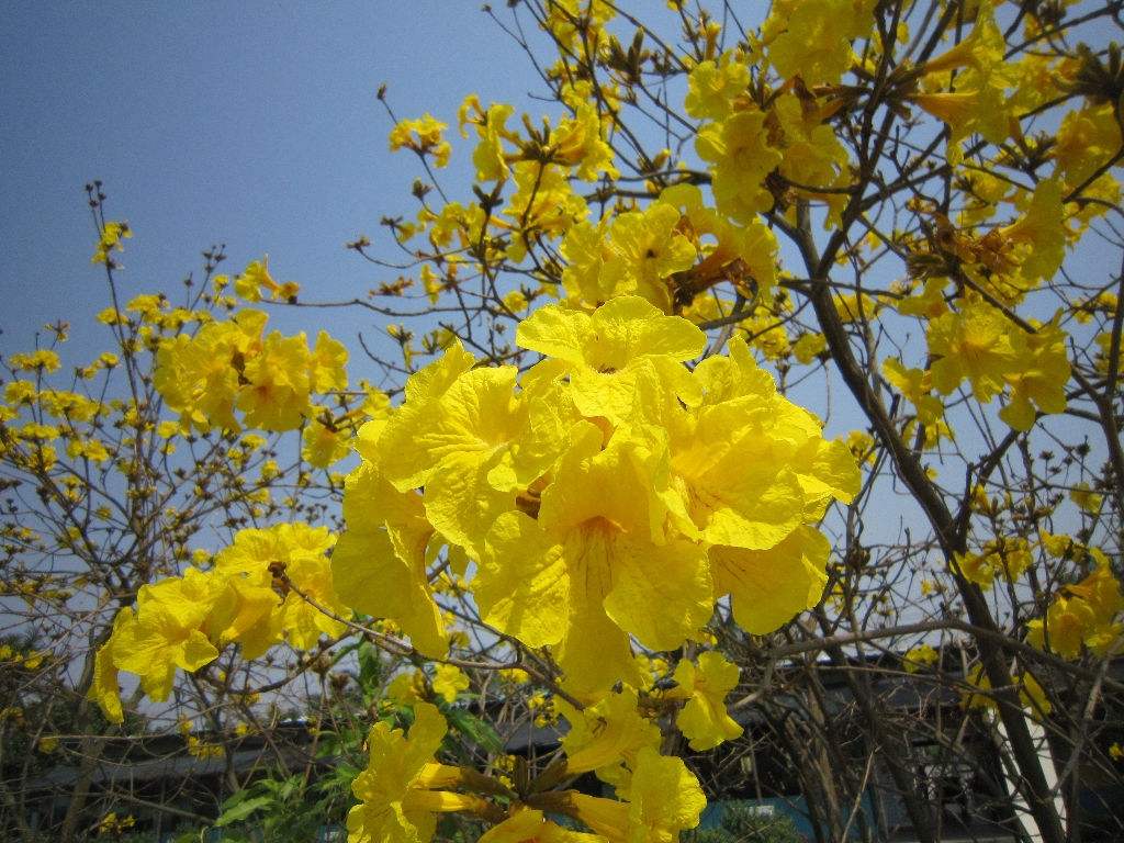黄钟木是紫葳科,风铃木属落叶乔木,高可达5米,树皮有深刻裂纹,小叶片对生,五叶轮生,卵状椭圆形,全叶被褐色细茸毛,先端尖,叶面粗糙;圆锥花序,顶生,花两性,萼筒管状,花冠金黄色,漏斗形,花缘皱曲,但为两侧对称花,甜香,子房二室,果实为蓇葖果,种子具翅;春季3-4月开花,先花后叶。原产墨西哥、中美洲、南美洲,1997年前中国自南美巴拉圭引进栽种。该种会随着四季变化而更换风貌的树。春天枝条叶疏,清明节前后会开漂亮的黄花;夏天长叶结果荚;秋天枝叶繁盛,一片绿油油的景象;冬天枯枝落叶,呈现出凄凉之美,这就是黄钟木在春、夏、秋、冬所展现出不同的独特风采。