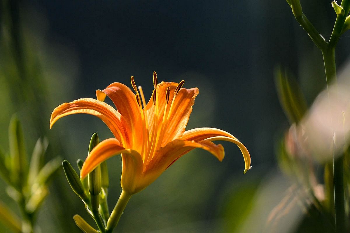 大花萱草是百合科,萱草属多年生宿根草本植物,根状茎粗壮,肉质根。叶基生、宽线形、对排成列,背面有龙骨突起,嫩绿色。花薹由叶丛中抽出,聚伞花序或圆锥花序,有花枝,花色模式有单色、复色和混合色。花大,漏斗形、钟形、星形等,外花被裂片倒披针形或长圆形,内花被裂片倒披针形或卵形,花药黄色、红色、橙色或紫色等多种颜色。子房上位,纺锤形,果实呈嫩绿色,蒴果背裂,5-10月开花。分布于亚洲温带至亚热带地区,日本、朝鲜和俄罗斯。中国北京、上海、湖南、黑龙江、江苏等省市均对大花萱草进行引种栽培。大花萱草耐旱、耐寒、耐积水、耐半阴、耐盐碱和耐瘠薄。大花萱草在园林花坛、花境、路边、草坪中丛植、行植或片植,也可作切花,大花萱草是园林绿化的好材料。