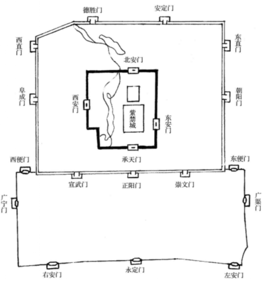 此外,在内城南面还有外城,其始建于嘉靖二十三年(1553),主要用于加强城防。原计划环内城四面一律加筑外垣,但当时因耗资巨大,仅建成环抱南郊之部分,开七个城门,故又被称为南城。外城城墙所开的七门被称为“外七”,分别为:南面的永定门、左安门、右安门,东侧的广渠门,西侧的广安门,东北隅的东便门,西北隅的西便门。
