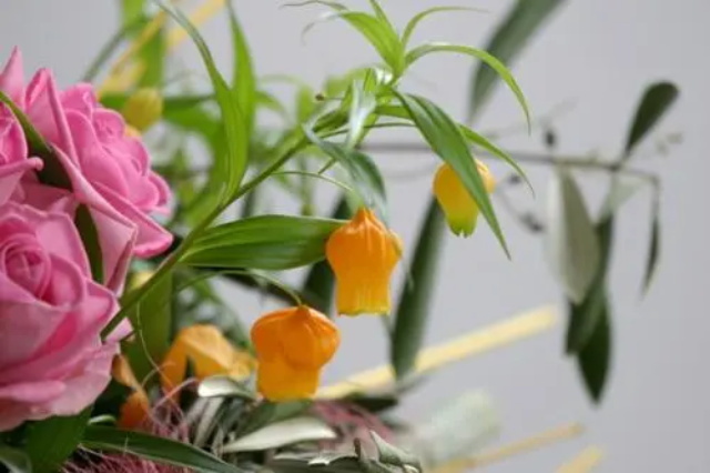 把2~3朵圣诞百合花做成迷你花束,裹上以白色的绢纱,系上细细的黄色缎带。放入礼品盒后,可在盒盖上也饰以黄色的缎带结。