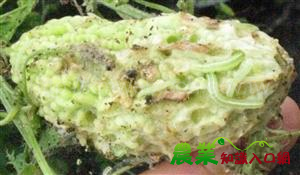 苦瓜生育期间遇到斜纹夜盗虫幼虫咬食叶片,由点状为害,随着虫体长大进而为害大片叶面,等果实长出后,将危害果面及果肉(附图)。