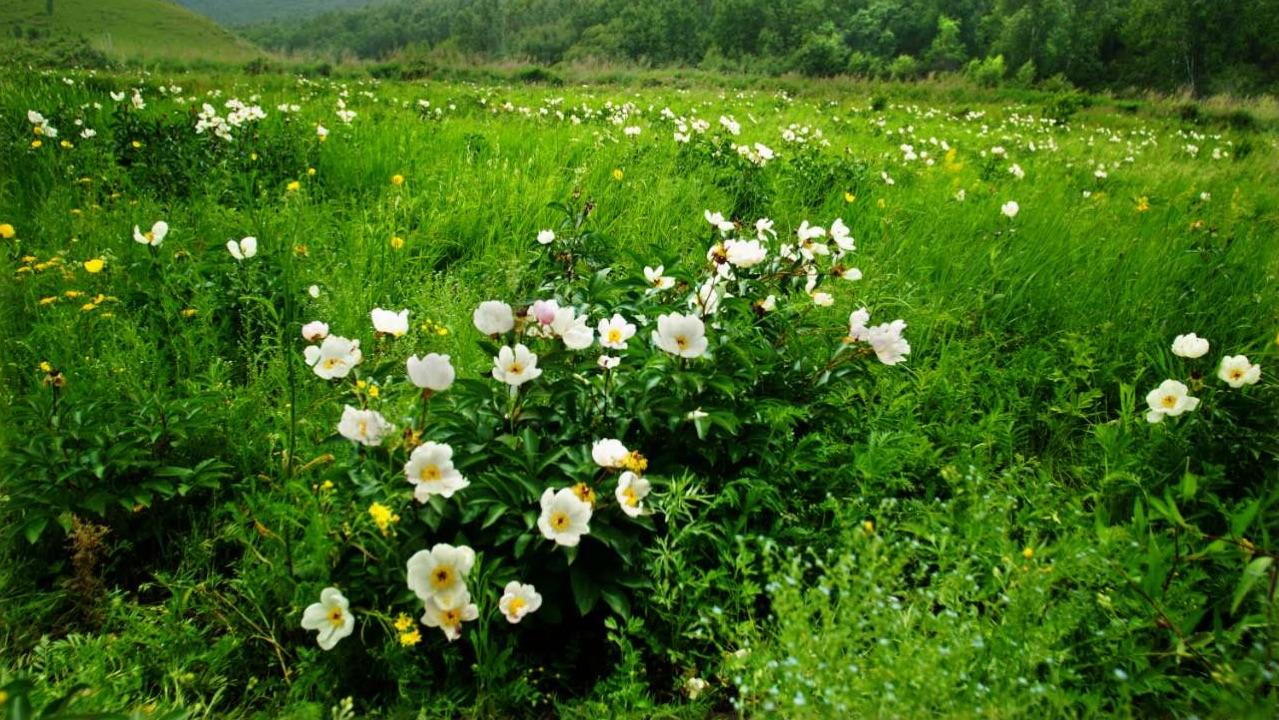 芍药盛开的季节,花色五颜六色的,特别是大草原上,一朵一朵的芍药花加上蓝天白云,让人忘记了时空,穿梭它们之间。