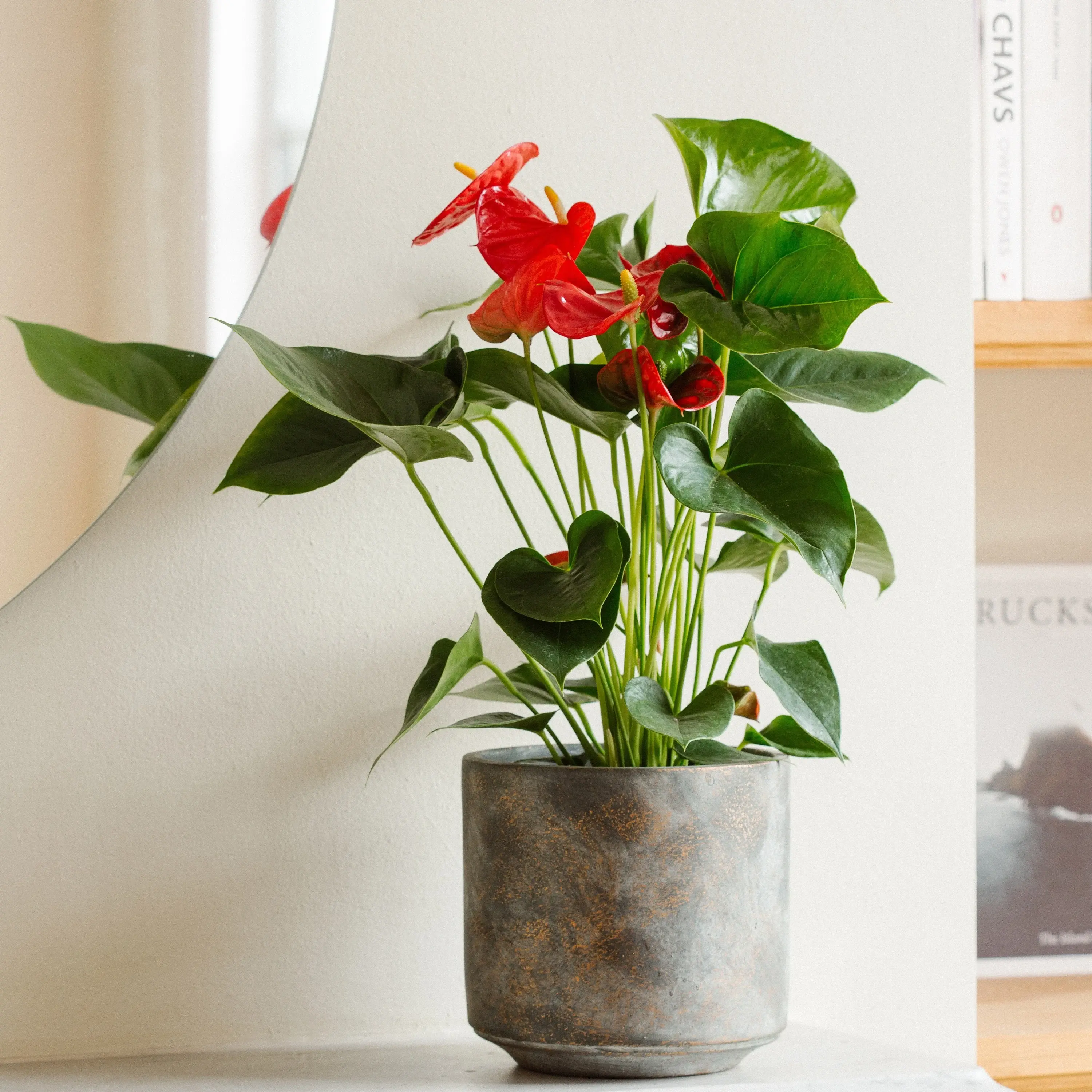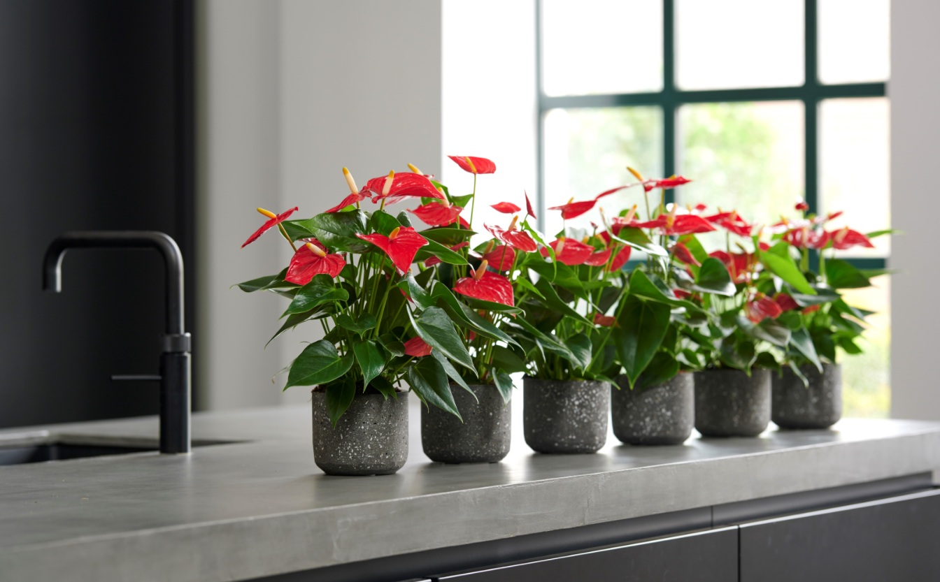 红掌,是从国外过来的物种,它原产地热带雨林,所以在那种缺光的环境长大的,它是特别耐阴的植物,它的叶片红红的,心型的花朵红红火火,特别的惹眼,加上它对光线的要求不是特别高,在家里散射光的位置都可以养,很快了就进入了千家万户,是比较常养的植物之一。