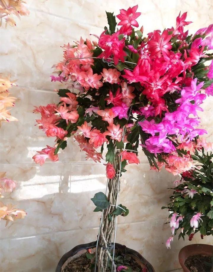 蟹爪兰是仙人掌科的植物,平时注意控制浇水,盆土干到一半,再给它浇透水。如果花苞太多,喷施一下磷酸二氢钾就可以。可以把几种颜色搭配在一起,漂亮艳丽,仙气十足,是过年时很喜欢的年宵级花卉。