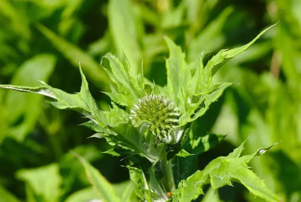 除了头上长刺儿,叶子和茎上也布满尖刺儿和毛,这样的结构让蓝刺头看起来还挺具有攻击性的,让人有一种“可远观而不可亵玩焉”的感觉。