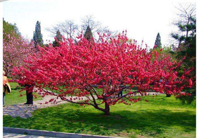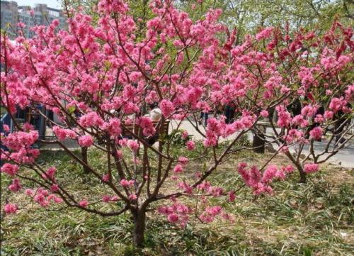 碧桃:是植物桃的变种,属于观赏桃花类的半重瓣及重瓣品种,统称为碧桃。落叶小乔木,高可达8米,一般整形后控制在3-4米之间。树冠广卵形,树皮灰褐色。枝条红褐色,无毛。单叶椭圆状或披针形。花单生或两朵生于叶腋。花有单瓣、半重瓣和重瓣,舂季先叶或与叶同时开放;花色有白、粉红、红和红白相间等色。原产中国,分布在西北、华北、华东、西南等地。世界各国多有引种栽培。