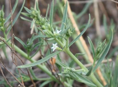 多年生柔弱草本,高15-40厘米,全株多少被白粉,无毛;茎细长,簇生,基部以上疏分枝,斜升,有纵沟。叶线形,长1.5-3.5厘米,宽0.5-1.5毫米,顶端急尖或渐尖,具单脉。花单一,5数,腋生;花梗短或很短,长3-3.5毫米;苞片1枚,线状披针形;小苞片2枚,线形,长2-6毫米,边缘粗糙;花被绿白色,长2.5-3毫米,花被管呈管状,花被裂片,顶端锐尖,内弯,内面的微毛不明显;雄蕊不外伸;子房无柄,花柱很短。坚果椭圆状或近球形,长或宽2-2.5毫米,淡绿色,表面有明显、隆起的网脉,顶端的宿存花被近球形,长约2毫米;果柄长3.5毫米。花期4-5月,果期6-7月。