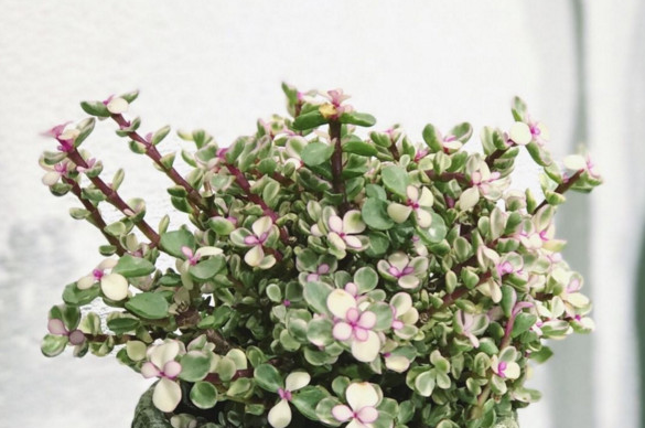 株高3~4米,老茎紫褐色,嫩枝紫红色,分枝近水平,肉质叶对生,绿色,倒卵形。雅乐之舞植株较矮,枝条也较为细弱,肉质茎红褐色(新茎)或灰白色(老茎):肉质叶交互对生,新叶的边缘有粉红色晕,以后随着叶片的长大,红晕逐渐后缩,最后在叶缘变成一条粉红色细线,直到完全消失。叶片大部分为黄白色,只有中央的一小部分为淡绿色;小花淡粉色,观赏价值不高。